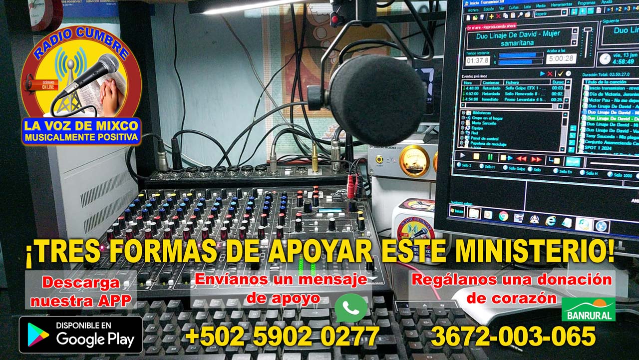 - Contacto: Apoya este ministerio radial y ayúdanos a construir el Reino de Dios. Para ayudas o donativos comunícate a los teléfonos del ministerio al(502) 5933 7386 y (502) 5902 0277 con el hermano Mario Sarceño, encargado.